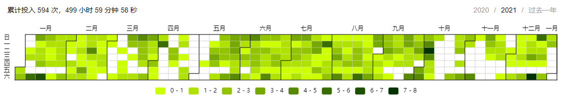 看到总共记录了 500 个小时。2021 年有 250 个工作日、115 个节假日,按每个工作日有 2 小时,每个节假日有 10 小时计算,2021 年共有 1650 小时可自由支配的业余时间。我只有效利用了其中的不到三分之一。但我已经很满意了,毕竟我只是个意志力薄弱的普通人。